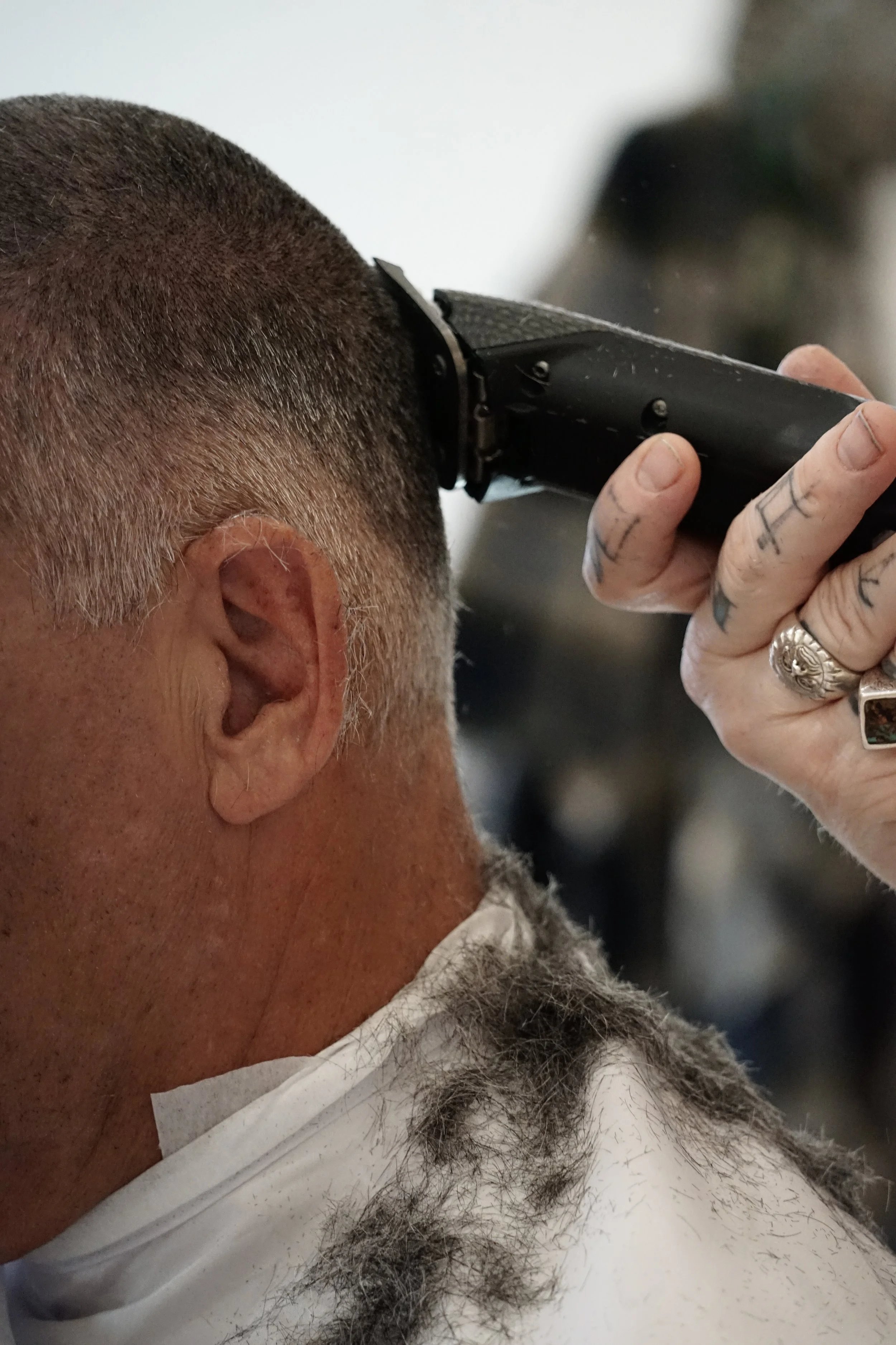Hair taken all the way down to the skin on the sides, like a baby’s bottom.